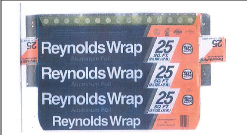 Reynolds owns two registrations for Reynolds Wrap packaging, filed in 1977 and amended in 1997. Reynolds’ 1997 specimen showed a package that was majority metallic blue, with the far right end pink, separated by a series of sharp diagonal silver lines. “Reynolds Wrap” is written on the blue area in bold silvery-white font and the square footage of the roll is in bold blue font on the pink area.