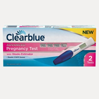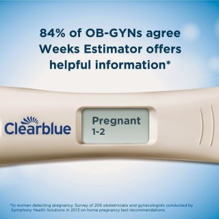 A woman tells a friend that she is pregnant, to which her friend exclaims “Really?!” The woman holds up two fingers and says “two weeks.” After her friend asks whether she has already seen a doctor, the woman responds “Not yet,” holds up the pregnancy test stick, and says “but I just took this new Clearblue test.” The scene moves to a close up of the test stick, with the Clearblue logo, and a display window with the word “Pregnant” and “1–2 Weeks” immediately below that word. The pregnant woman then is heard to say “It’s like two tests in one!” The scene then changes to a graphic reflecting the three display windows noted above, while an announcer states “the new Clearblue pregnancy test also estimates how many weeks.” At the end of the commercial, the announcer concludes “Weeks Estimator. Only from Clearblue.”