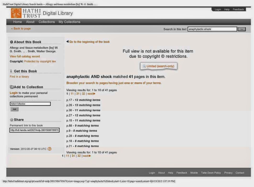 Several research universities allowed Google to scan their collections; then they created a repository for the digital copies, the HathiTrust Digital Library (HDL), which currently has 80 member institutions and over ten million works. HathiTrust allows the public to search for particular terms. Unless otherwise authorized, the search results show only page numbers and the number of times the term appears, with no snippets, like so:
