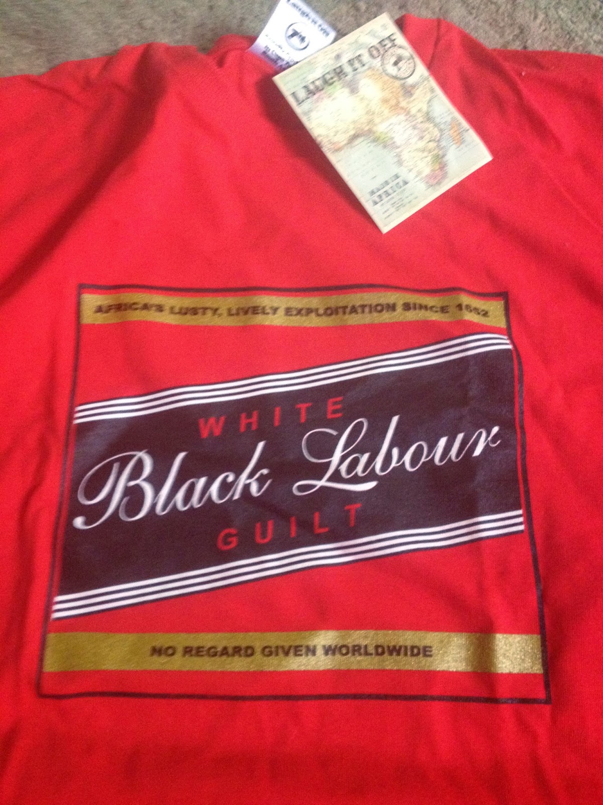 I just acquired the Black Labour, White Guilt T-shirt from the Laugh It Off case, and I’m taking the opportunity to share some other parody shirts as well.
