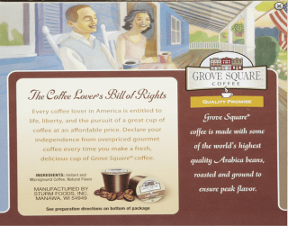 | Coffee Lover’s Bill of Rights/”highest quality Aribica beans, roasted and ground to ensure peak flavor” |