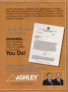 In 2006, defendant Ashley began running ads with the caption “Caveat Emptor.” One asked, “Is It REALLY LEATHER?” The said “[s]ome upholstery suppliers” were “using leather scraps that are mis-represented as leather; adding a denim barrier to this material and using it for bicast, and as corrected grain leather in locations where you would expect top grain.” The ad concludes: “Know What You Are Buying” and “REMEMBER … The Overseas Manufacturer Has NO Liability In The U.S.A. YOU DO!” Ashley contended that it wasn’t aware that DRI sold bonded leather until over two months after the first ad ran, and also argued that its ad was referring to a Chinese product consisting of “glued-together leather ‘scraps’ for backing material” as opposed to NextLeather’s “ground-up leather ‘shavings.’” DRI nonetheless argued that the ad specifically targeted it and accused it of violating the law, at a time coinciding with a criticial industry meeting where retailers make many purchasing decisions.