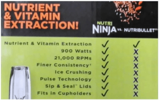 In addition, the Nutri Ninja Pro package says “# 1 MOST POWERFUL*,” which Homeland likewise contended was false. The asterisk corresponded to a small-print disclaimer on the bottom of the box, which states: “ *Based on wattage of single serve blenders and nutrition extractors MSRP under $100.” (Here’s a related case against Euro-Pro for making a “More Powerful” claim with a similarly hidden small print limitation.) Homeland also argued trade dress infringement.