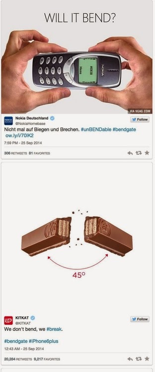 Via firstmemes, consider the extent to which (1) a reference to a famous mark can be indirect and still trigger dilution law; (2) the tweets from competitors are explicitly protected by federal dilution law’s exemption for comparative advertising, but the tweets from noncompetitors might not be; (3) the tweets from competitors might be dilutive under state law, but the tweets from noncompetitors might not be (Deere v. MTD and Hormel v. Jim Henson Productions) (and remember, there’s no preemption because none of these folks have registered Apple or iPhone).