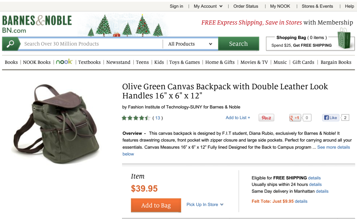 Nor could her Lanham Act false advertising claim survive. She didn’t plausibly allege a false or misleading statement. The only statement at issue was the description of her backpack on the Barnes & Noble websites: “This canvas backpack is designed by F.I.T. student Diana Rubio, exclusively for Barnes & Noble!” The court found this to be true: Rubio’s own allegations established that she designed the backpack while a FIT student, for submission to B&N. “[T]he Drawing’s multiple references to ‘B & N’ and ‘Barnes & Noble’ belie any claim that it was not made specifically for Barnes & Noble.” Thus there was nothing false or misleading about the statement. Note: Dastar might be needed to sew up the reasoning here. The implication—perhaps even the necessary implication—of B&N’s statement is that Rubio willingly participated/authorized B&N to use her design; that part isn’t true, but it’s (1) unlikely to be material, and (2) the kind of implication Dastar may put off limits.