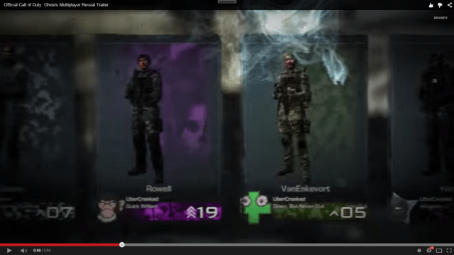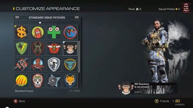 Ghosts is the tenth installment in the Call of Dutyfranchise. Ghosts “depicts highly realistic combat in a near-future, war-torn setting, featuring numerous characters, complex narratives, and advanced graphics. Its main protagonists are the Ghosts—a force of U.S. Special Operations personnel trained to conduct secret missions behind enemy lines.” The game uses “dozens of contemporary weapons and vehicles that players can customize with modifications or attachments, and a variety of military equipment based on real-life counterparts or portrayals of future designs.” It likewise uses “names and insignia of contemporary forces such as the National Security Agency, the United States Marine Corps, and the United States Air Force.” A new feature allows players in multiplayer mode the option to customize their avatars, including gender, uniform style, gear, accessories, and over 600 patches. Thirty-two patches are available at the beginning, while more can be unlocked as rewards, and others are available for download; the angry monkey is one of the standard 32.