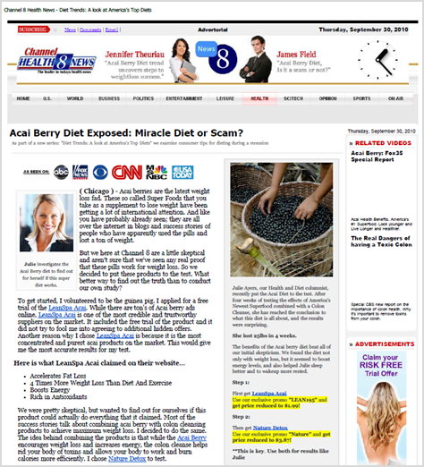 LeadClick argued that it did not directly violate the FTCA or CUTPA (the state statute, also allegedly violated) and that there was no aiding and abetting liability under CUTPA. Initially, the court found the fake news sites deceptive, using logos of genuine news outlets and formatting as if they were news articles. E.g., a caption under a picture of a reporter reads, “Julie investigates the Acai Berry diet to find out for herself if this super diet works.” The articles said, “[W]e here at [purported news station] are a little skeptical and aren’t sure that we’ve seen any real proof that these pills work for weight loss. So we decided to put these products to the test. What better way to find out the truth than to conduct our own study?” The article then goes on to describe a week-by-week analysis of the reporter’s results in using LeanSpa products, and concludes, “After conducting our own personal study we are pleased to see that people really are finding success with it (myself included 🙂 ).” These were express claims of independent investigation.