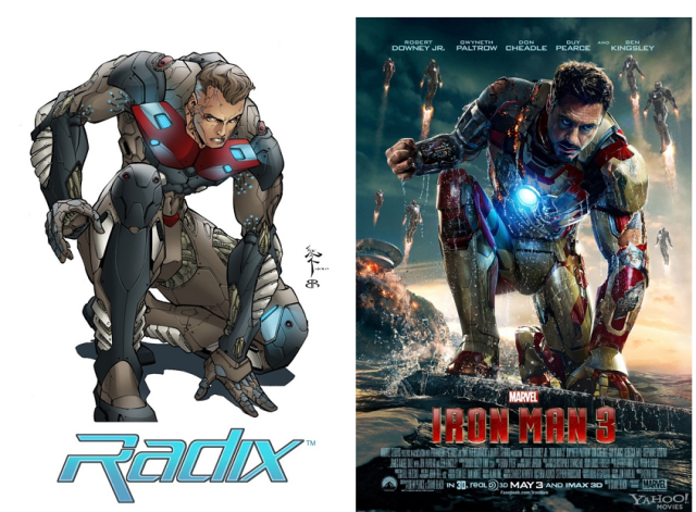 Horizon Comics Prods., Inc. v. Marvel Entertainment, LLC, No. 15-cv-11684 (D. Mass. filed Apr. 23, 2015): Newly filed; the claim is that movie Iron Man’s armor infringes the copyright in another comic armored suit. All I’ll say right now is that one part of the allegations is clearly silly: the complaint alleges that one movie poster is a copy of an image from plaintiffs’ cartoon: