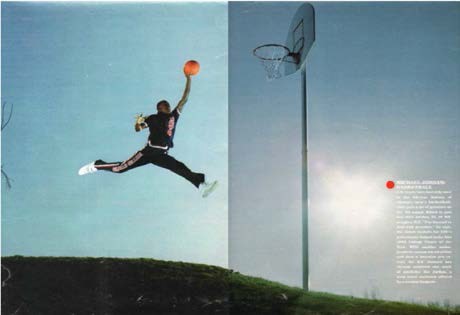 Rentmeester shot a photo of then-North Carolina student Michael Jordan for a 1984 issue of LIFE magazine. Instead of a conventional gym shot, Rentmeester photographed Jordon outdoors, “on a relatively isolated grassy hill with no visual distractions other than the setting sun and a basketball hoop he had temporarily installed on the hill.” He wanted an untraditional pose, so he instructed Jordan “to jump straight up and perform a grand jeté, a ballet leap, while holding a basketball.” Rentmeester argued that he was the first person ever to photograph a basketball player in this specific pose. In his view, “the creative genius of the pose, and the overall construction of the image, is to trick the viewer into thinking that Mr. Jordan is actually performing a dunk when in fact he is not.” To get this effect, Rentmeester put his camera approximately 90 degrees to Jordan’s apparent trajectory and slightly below, creating an effect of looking up at Jordan. To get precise detail, Rentmeester used a very rapid shutter speed and powerful synchronized strobe lights.