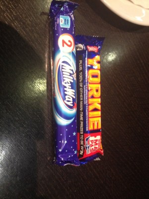 | English Milky Way, apparently caramel-less, and Yorkie (note the Yorkie’s offer of Man Prizes, which I can only assume are paid more than Woman Prizes) |