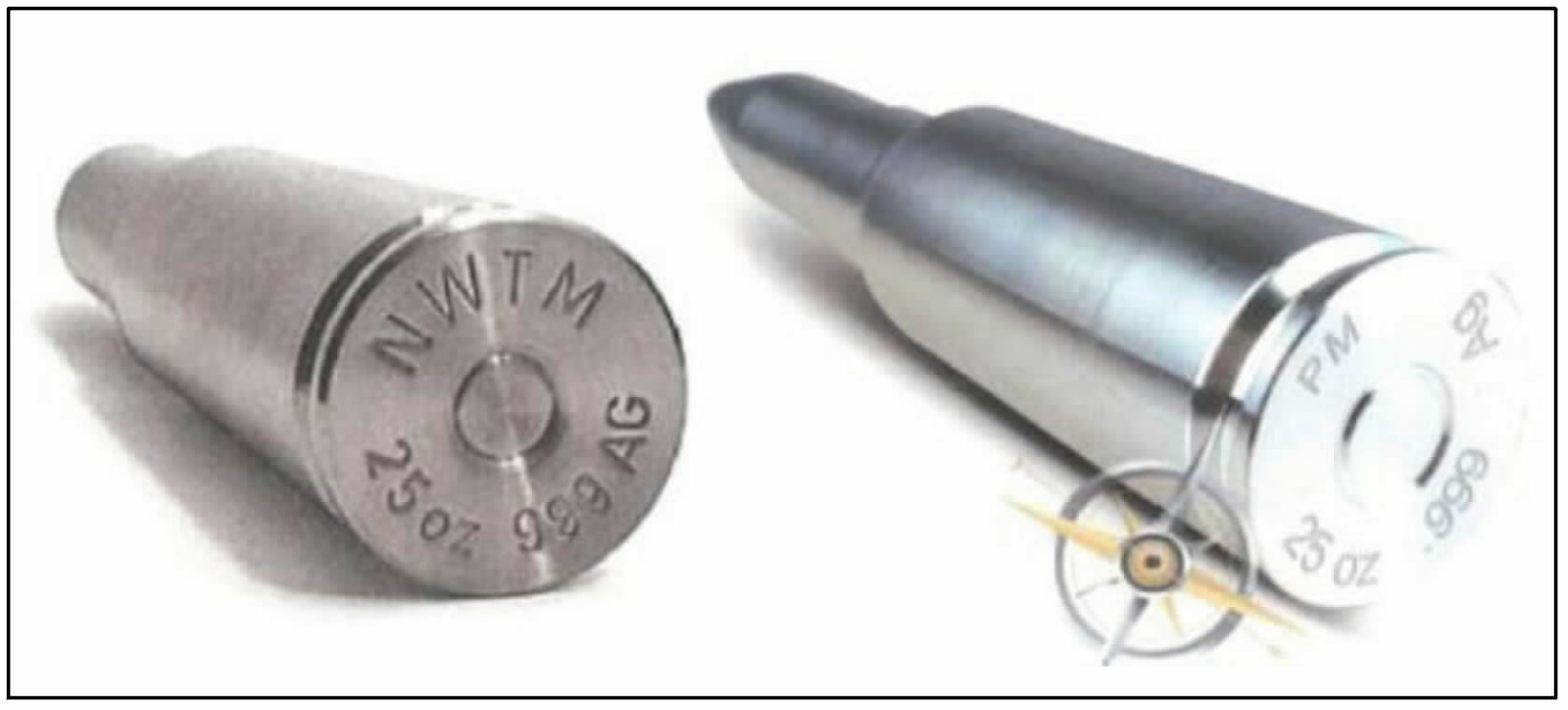 NWTM first conceived of the idea of using silver bullion to copy famous ammunition into sizes that would easily convert to weights in even troy ounces in 2008. NWTM therefore measured sample ammunition with a digital caliper and micrometer, viewed pictures of sample bullets on the Internet, and consulted published industry standards for ammunition dimensions. NWTM also bought hundreds of different ammunition rounds, focusing on popular shapes and sizes, and sought to recreate bullets at volumes that approximated even weights. NWTM altered the dimensions of the original .45 round it chose to match the desired bullion weight, but still sought to appeal to a “gun person, or anyone buying bullion.” NWTM ultimately resorted to CAD software to make the code used by its manufacturing machines.