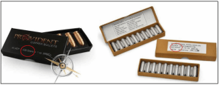 Provident claimed to have come up with the replica bullet idea independently of NWTM, but whatever. It too used CAD and minor adjustments to achieve the desired weight. Provident instructed its manufacturer to make the head stamp look as similar to live ammunition as possible, and to include the weight, purity, composition, and “PM,” Provident’s “mint mark.” Both parties used Tahoma font, with Provident contending that this was the font that looked closest to real ammunition. Provident designed its packaging to “look like an ammo box,” and began selling copper replicas in 2013, with silver arriving in November.