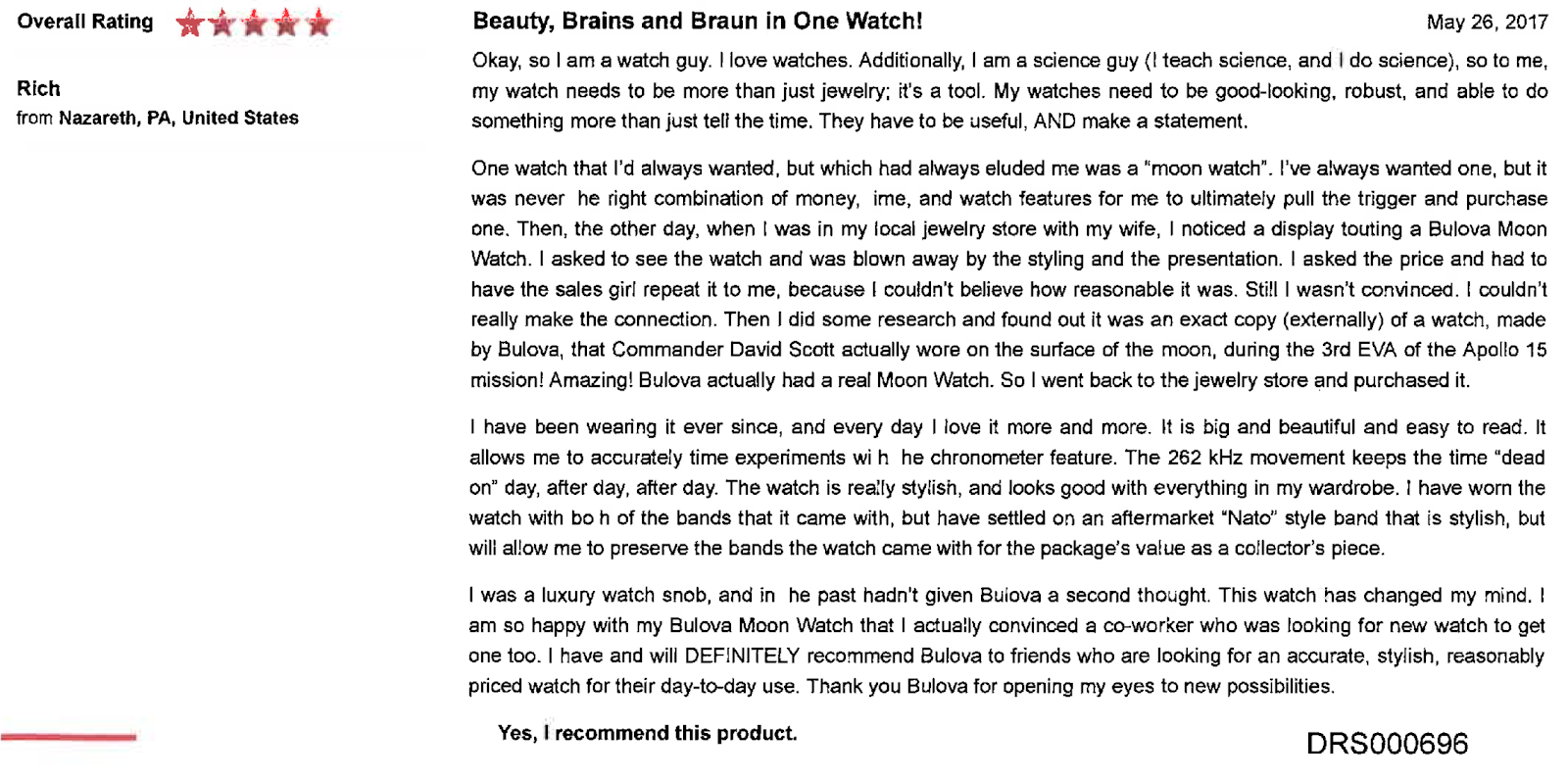 the Moon Watch; and (3) other public and internal communications by Bulova and