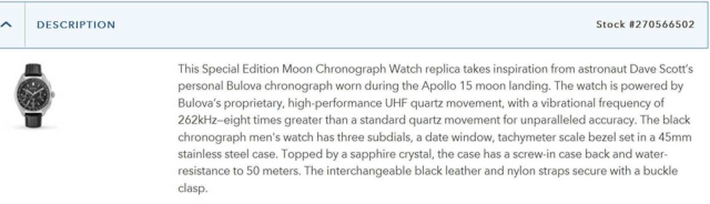 Watch”) based on the original chronograph that Scott wore to the moon. Many of Bulova