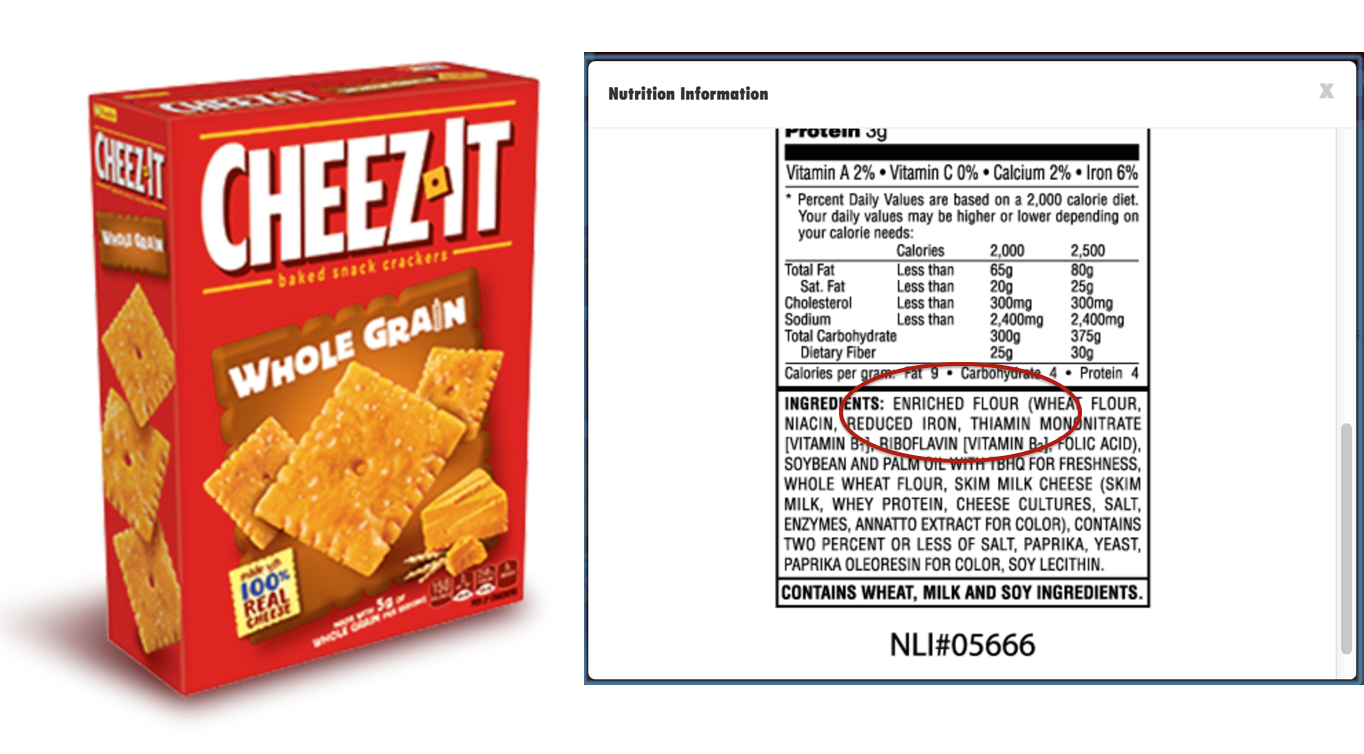 SERVING” in small print on the bottom or “MADE WITH WHOLE GRAIN” in large print