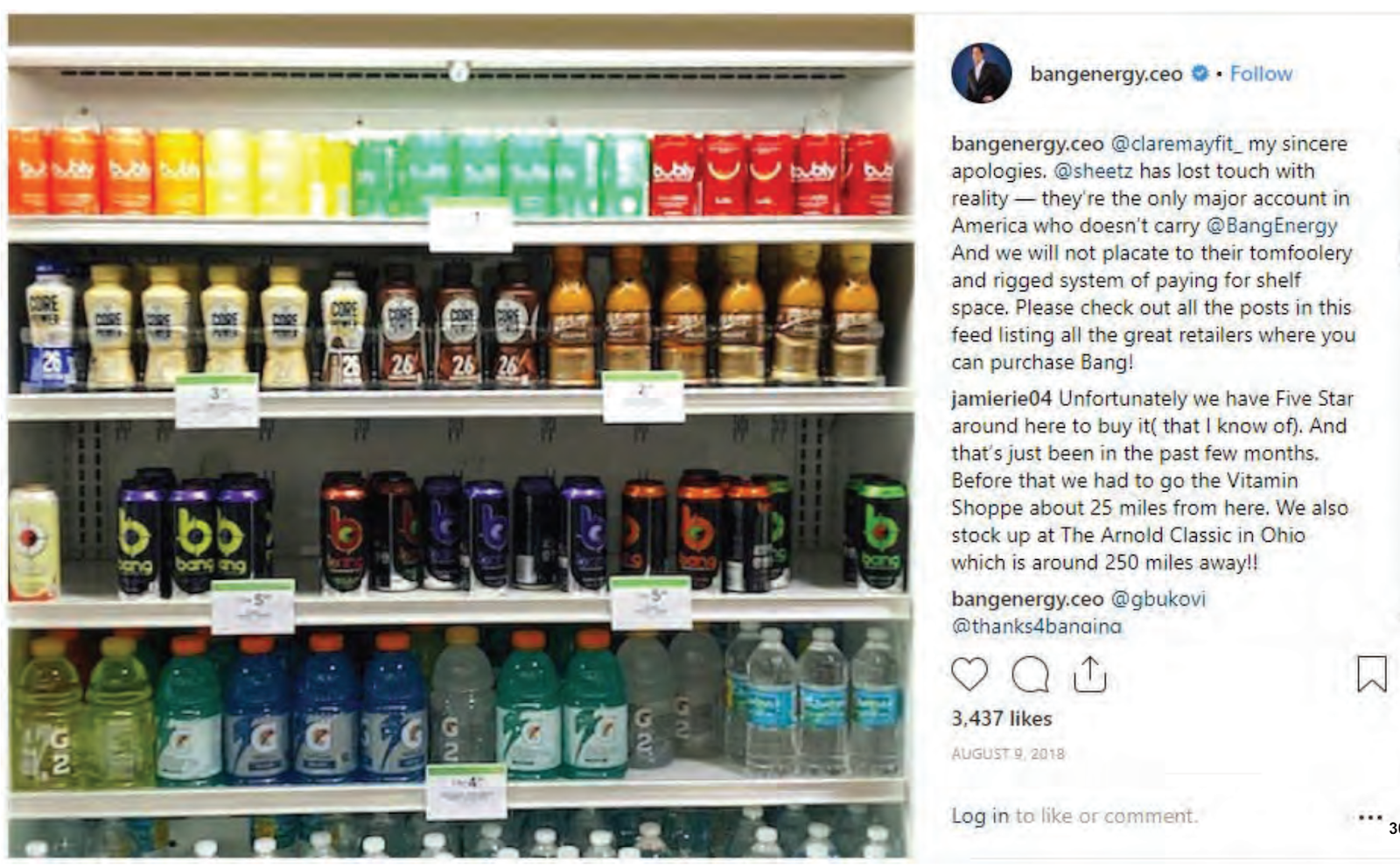 four cans of a single flavor of BANG purchased from the same retail store in