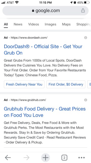 Screenshot of mobile search results for “Grubhub.” Note also “Great Grubs” in the DoorDash blurb. I don’t think it’s unlawful, but it’s kind of tacky:
