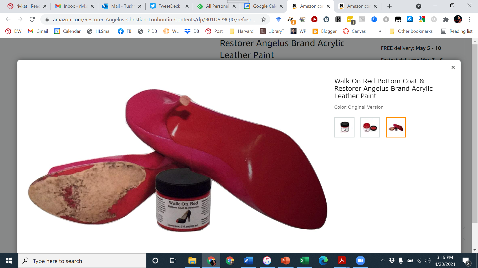 I’ve recently seen two examples of the following phenomenon: off of Amazon, an advertiser uses images of its product with another well-known product, and they do go together, but on Amazon, the advertising is different. Anyone know if there’s an Amazon policy driving this? For those circuits that require the advertiser to have a good reason to refer to the trademark owner in order to justify nominative fair use, the Amazon ads would seem to show it’s possible to advertise without using the other mark. Special kudos to the Angelus paint for using an all-red shoe on Amazon, which isn’t a “use” of the Louboutin mark